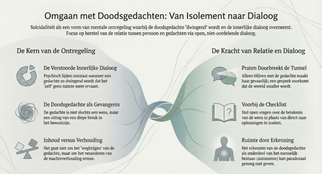 Een gesprek doorbreekt die isolatie. Maar dat werkt alleen wanneer er relatie is. Wanneer iemand tegenover je zit die blijft, luistert en niet meteen wil oplossen. Vanuit zo’n relatie kun je de doodswens samen onderzoeken.