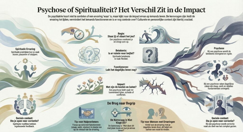 Dit onderwerp verdient een plek op PsychoseNet omdat het draait om wederzijds begrip. Mensen willen geen stempel, professionals willen geen risico missen. De brug zit in de verschuiving van de vraag of iets waar is naar de vraag of je ermee kan leven.