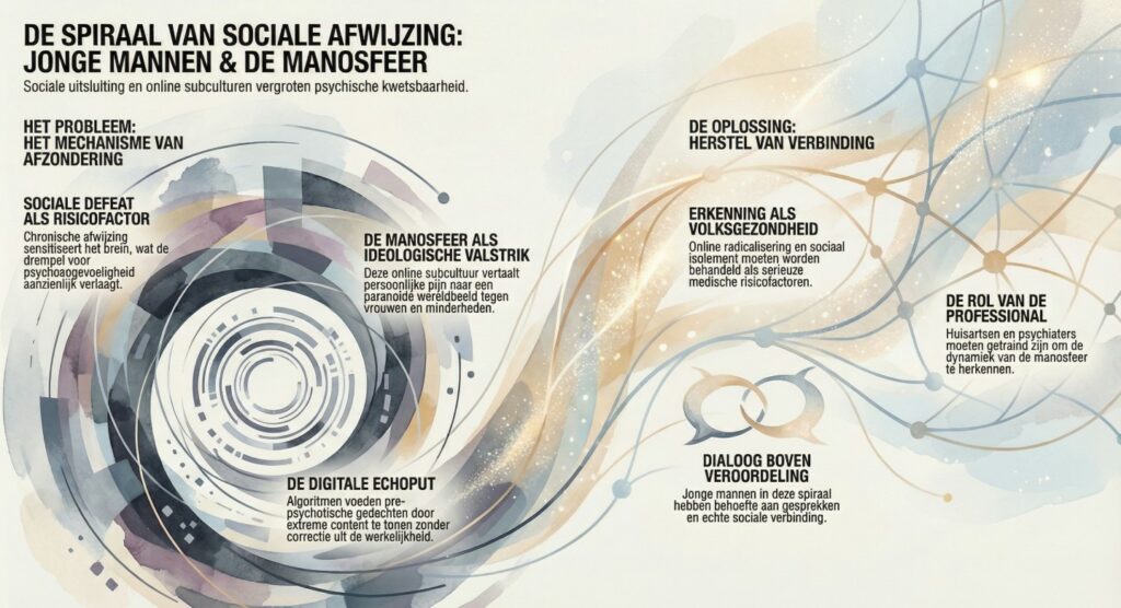 Sociale afwijzing en psychosegevoeligheid hangen nauw samen: wie voortdurend wordt buitengesloten of afgewezen, kan een groter risico lopen op mentale ontregeling. De manosfeer kan voor hun gevoel tijdelijk begrip bieden, maar versterkt vaak juist deze kwetsbaarheid. Wat betekent dit voor hun psyche en hoe schadelijk is de ideologie die ze daar vinden?